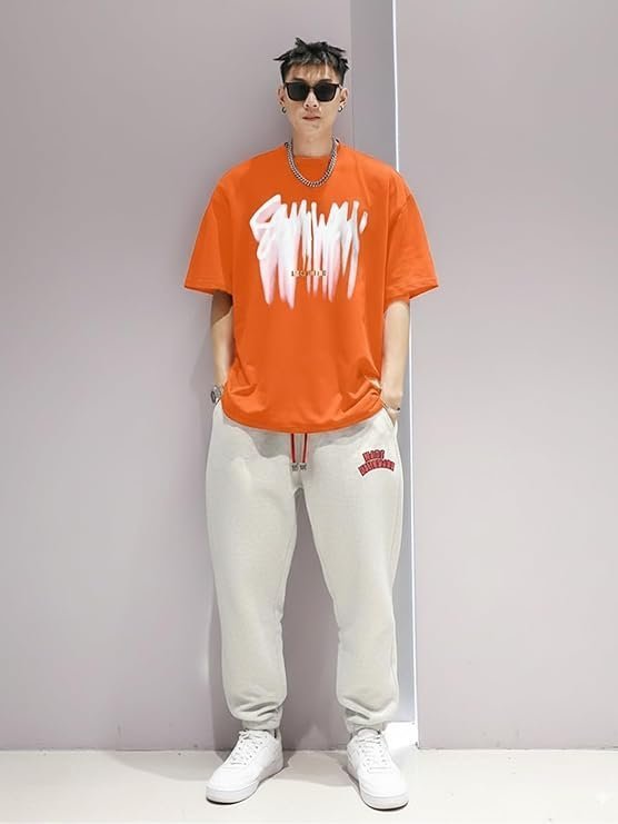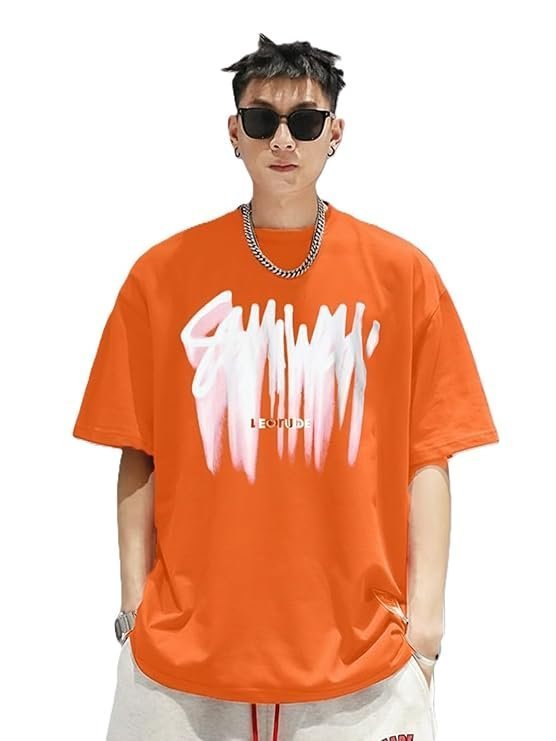 Half Sleeve Cottonblend Graphic Print Round Neck T-Shirt, Orange
