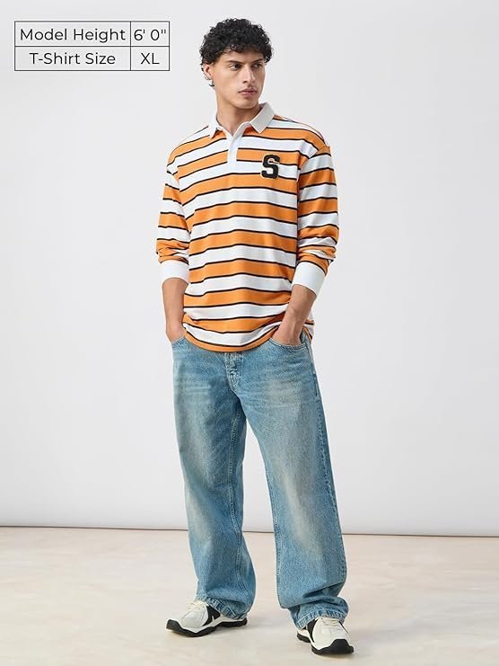 Men’s Long Sleeves Collared Neck Striped T-Shirts, White/Orange