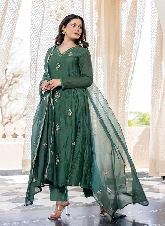 Women Embroidery Solid Anarkali Kurta and Pant Set with Dupatta, Green
