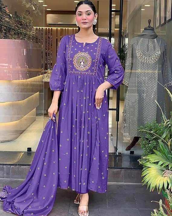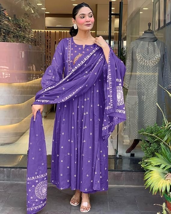 Women Rayon Printed Anarkali Kurta Set with Dupatta, Purple