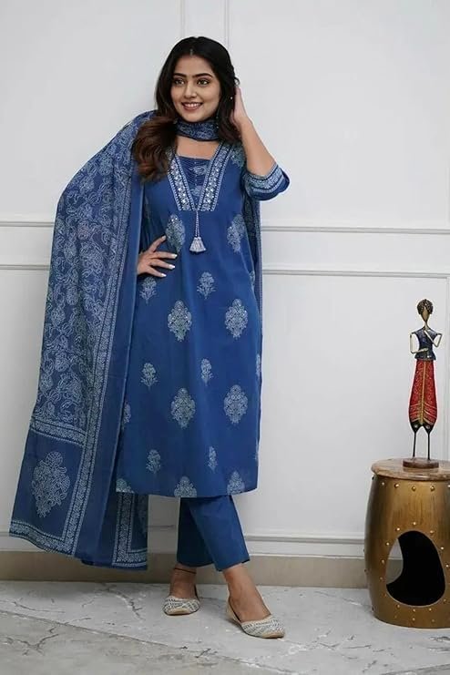 Women’s Pure Cotton Printed with Handwork Kurta Set, Navy Blue