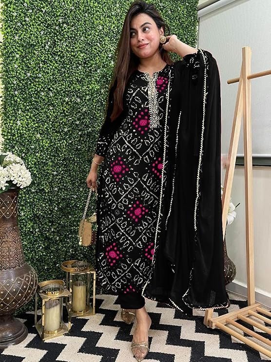 Women’s Rayon Viscose Straight Bandhej Printed Kurta with Pant & Dupatta, Black